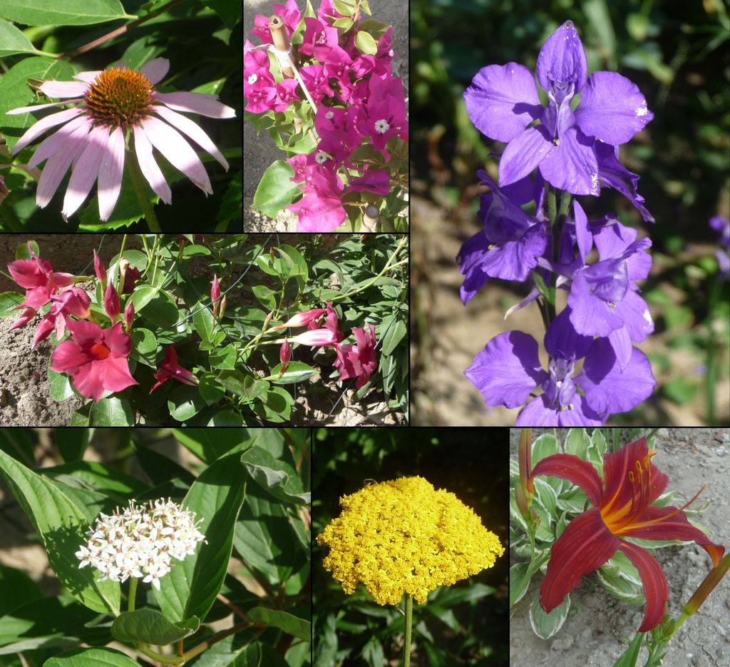 Az első sor első virága bíbor kasvirág (Echinacea purpurea), halványlilás, rózsaszínes a szirma. A mellette levő az Bouganvillea, vagy magyarul: murvafürt. Alatta a hosszú képen: jázmintölcsér, vagy mandaville. Mellette szarkaláb. Alul: fehér som, cickafark, és sásliliom (Hemerocallis 'Cherry Point')..
